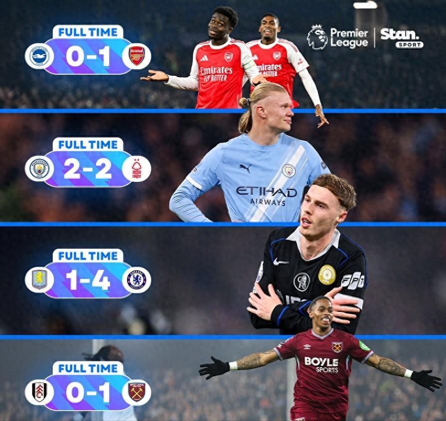 阿森纳客场1-0小胜布莱顿,萨卡闪击破门,枪手领先后专注防守保住胜果。曼联客场1-2不敌纽卡斯尔联,上半场补时阶段戏剧性十足,拉姆塞红牌下场,B费送点又助攻卡塞米罗扳平,下半场曼联未能破门,反被纽卡奥苏拉绝杀,卡里克执教红魔首败。